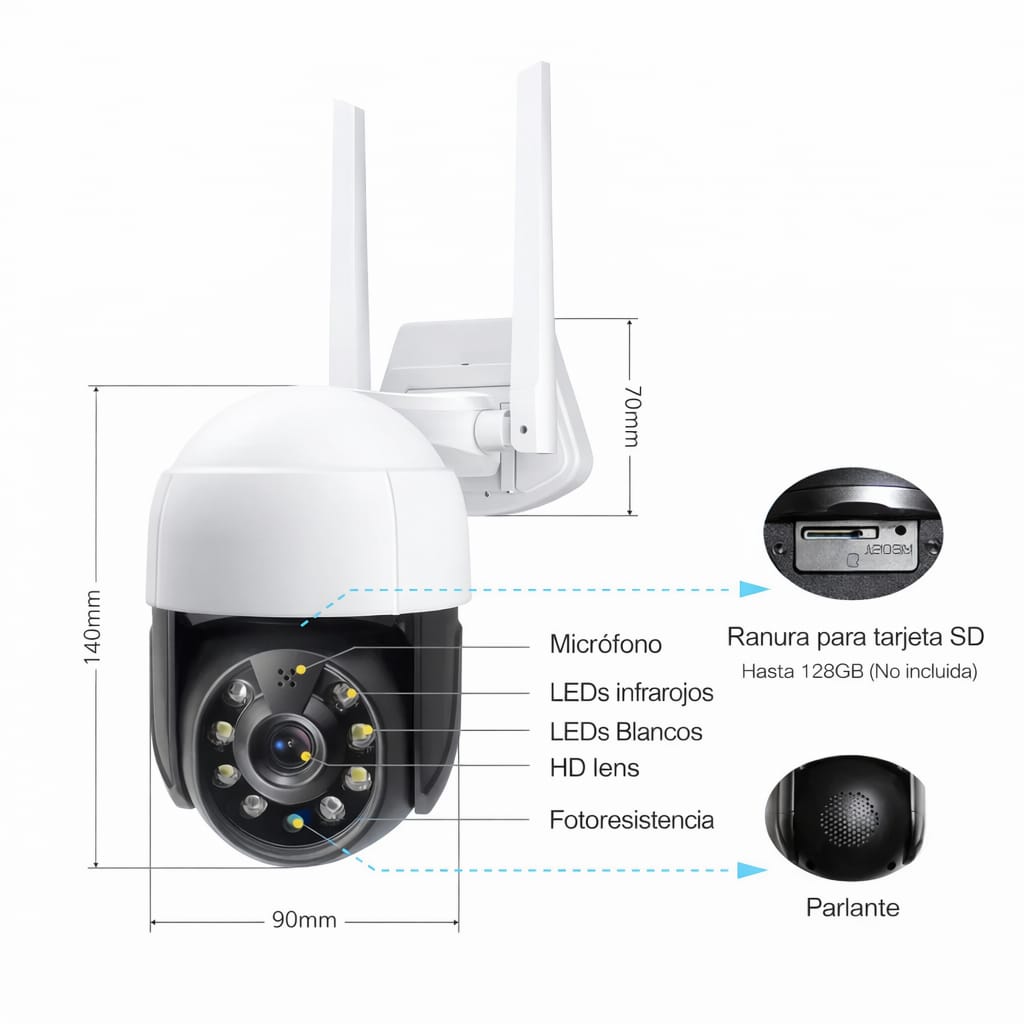 Para vigilancia nocturna, integra un sistema de visión nocturna avanzada con doble iluminación (infrarrojo + luz blanca), permitiendo ver imágenes en blanco y negro o en color incluso en completa oscuridad, con un alcance aproximado de hasta 20 metros.