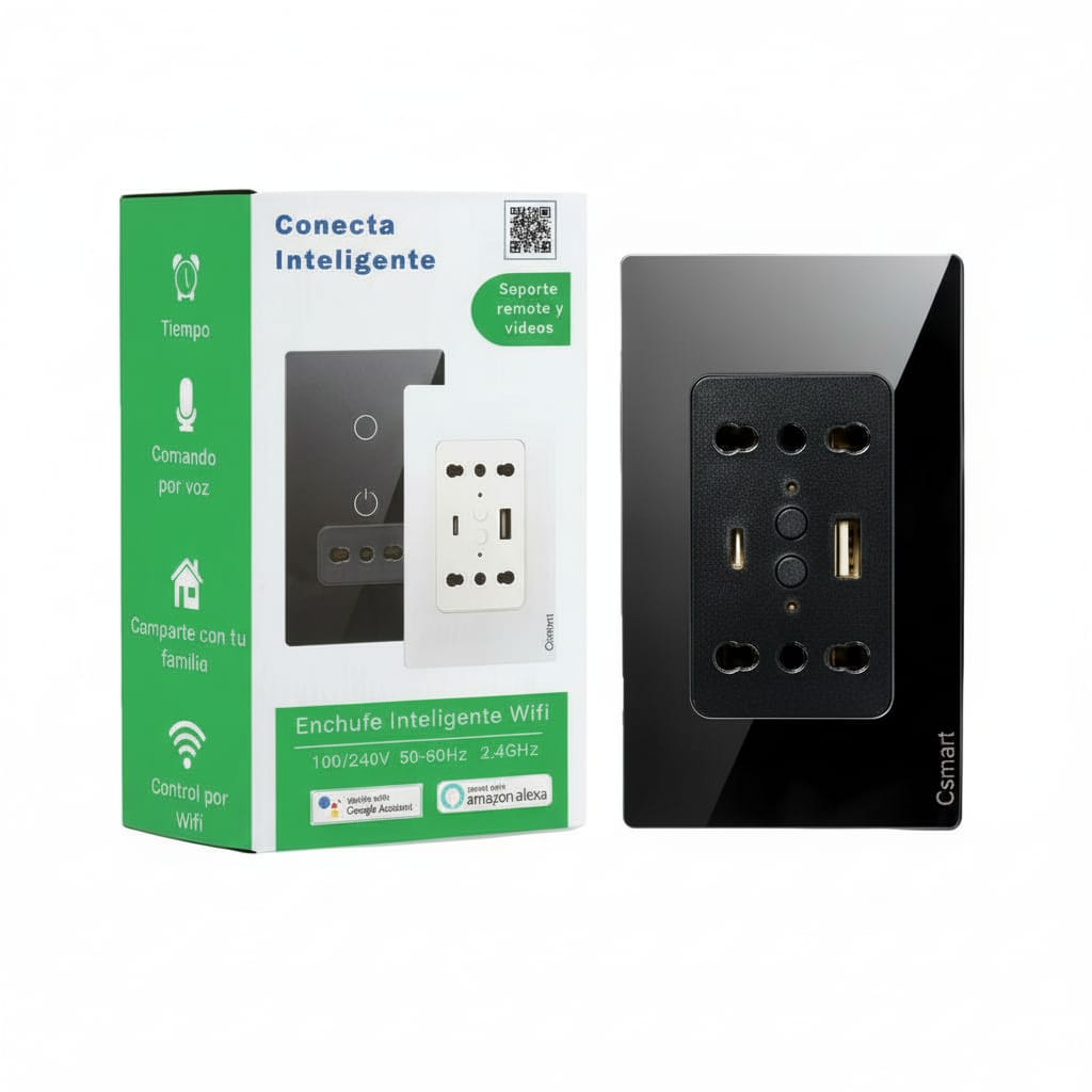 Enchufe Inteligente Wifi Doble + Usb Y Tipo C- Placa Vidrio Negro